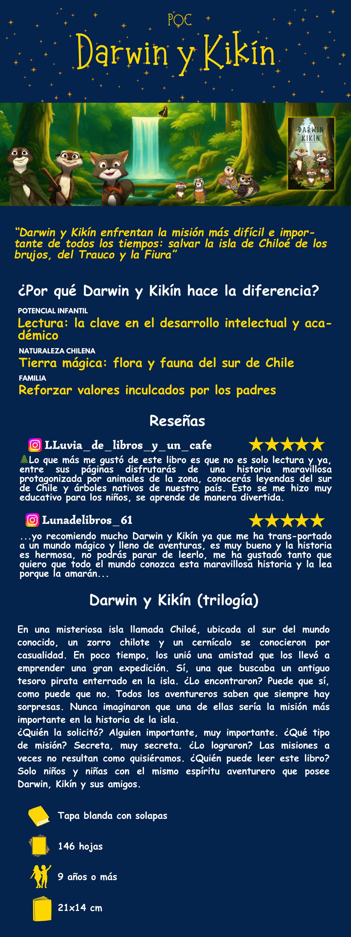 Las historias de un zorrito chilote y de un polluelo de cernícalo nacido en los valles centrales se unieron a través de una nueva y gran amistad, en los majestuosos bosques de la isla de Chiloé. La pasión que ambos compartían por las aventuras los llevó a planear una gran búsqueda de un tesoro pirata enterrado hace siglos. En su camino encontraron a una nutria misteriosa, que les explicó qué estaba sucediendo en la isla y les relató la leyenda más secreta y espectacular de Chiloé. ¿Es tan solo una leyenda o Darwin y Kikín estaban a poco tiempo de ser parte de ésta?